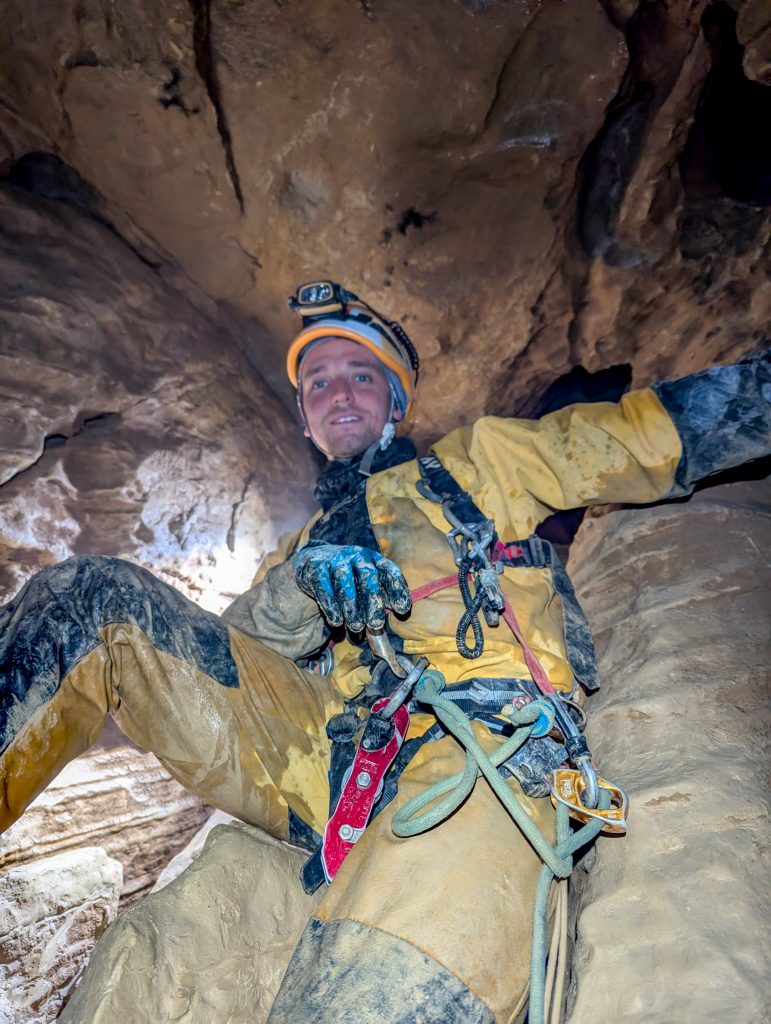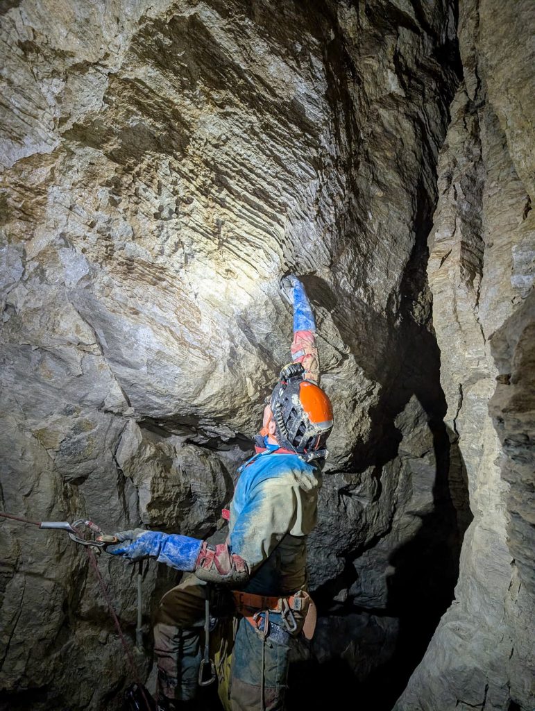 Le départ ne ressemble pas vraiment à un puits. Du coup, je pense qu’il nous manque une corde et je sors la corde de secours. Plus bas, je pense qu’on est dans le puits, et que la corde de 75m aurait dû partir du haut. On trouve des spits, c’est un peu dans l’eau. Je m’engage, et visiblement, vu ce qu’il y aurait à purger, ce n’est pas là.