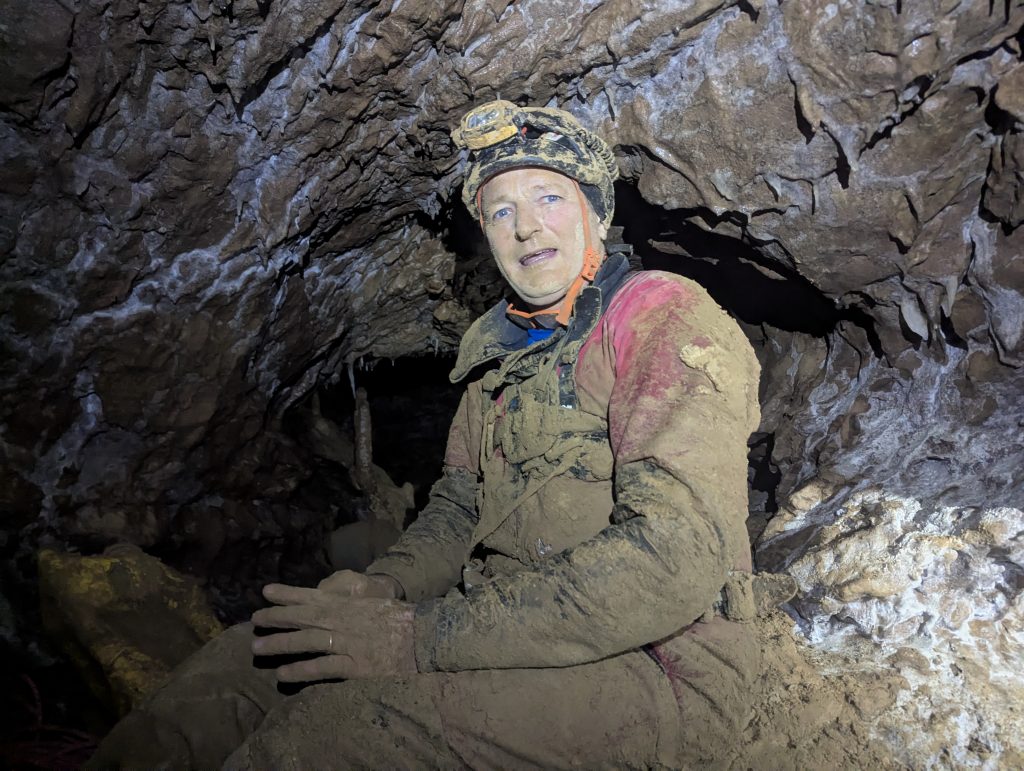 On trouve une autre galerie, et ça ressemble à la désob argileuse, il y a un fort courant d’air, on est bons! Maintenant qu’on est couverts de boue liquide, on remet une couche de boue sèche par dessus! Un régal !