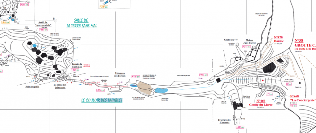 Le fond de la salle d’entrée a été sévèrement désobstrué pendant des années : « Le couloir des Humbles ». La montée dans la trémie du Chat-man est un peu sportive pour rejoindre la « Salle de la Terre sans mal ».