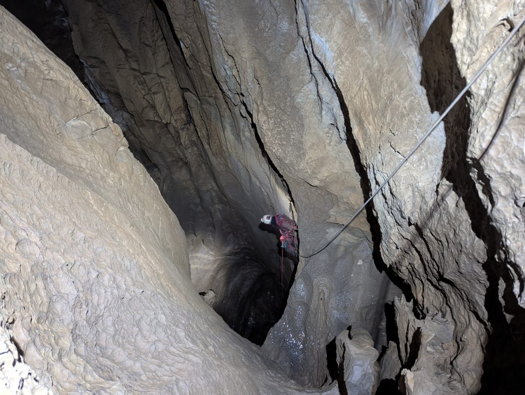 Manifestement, on crame une corde sur un truc qu’on ne se sent pas de descendre en libre et … du coup, il nous manque une corde pour atteindre le siphon. Pas cool, ça ne valide pas la sortie !