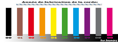 La corde possède à l’intérieur de l’âme un fil témoin de couleur. Chaque couleur correspond à l’année de fabrication, quel que soit le fabricant :
